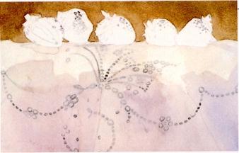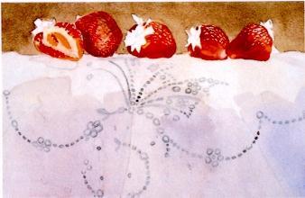 A gray-green background and a pale modified Cobalt Blue wash on the cloth set up the white highlights on the strawberries as the lightest value. Save the eyelet pattern and the highlights on the strawberries with frisket.