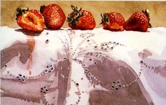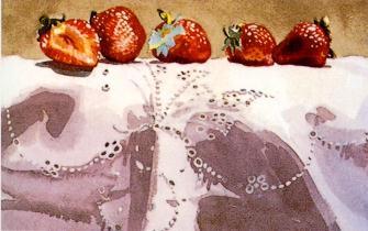A gray-green background and a pale modified Cobalt Blue wash on the cloth set up the white highlights on the strawberries as the lightest value. Save the eyelet pattern and the highlights on the strawberries with frisket.